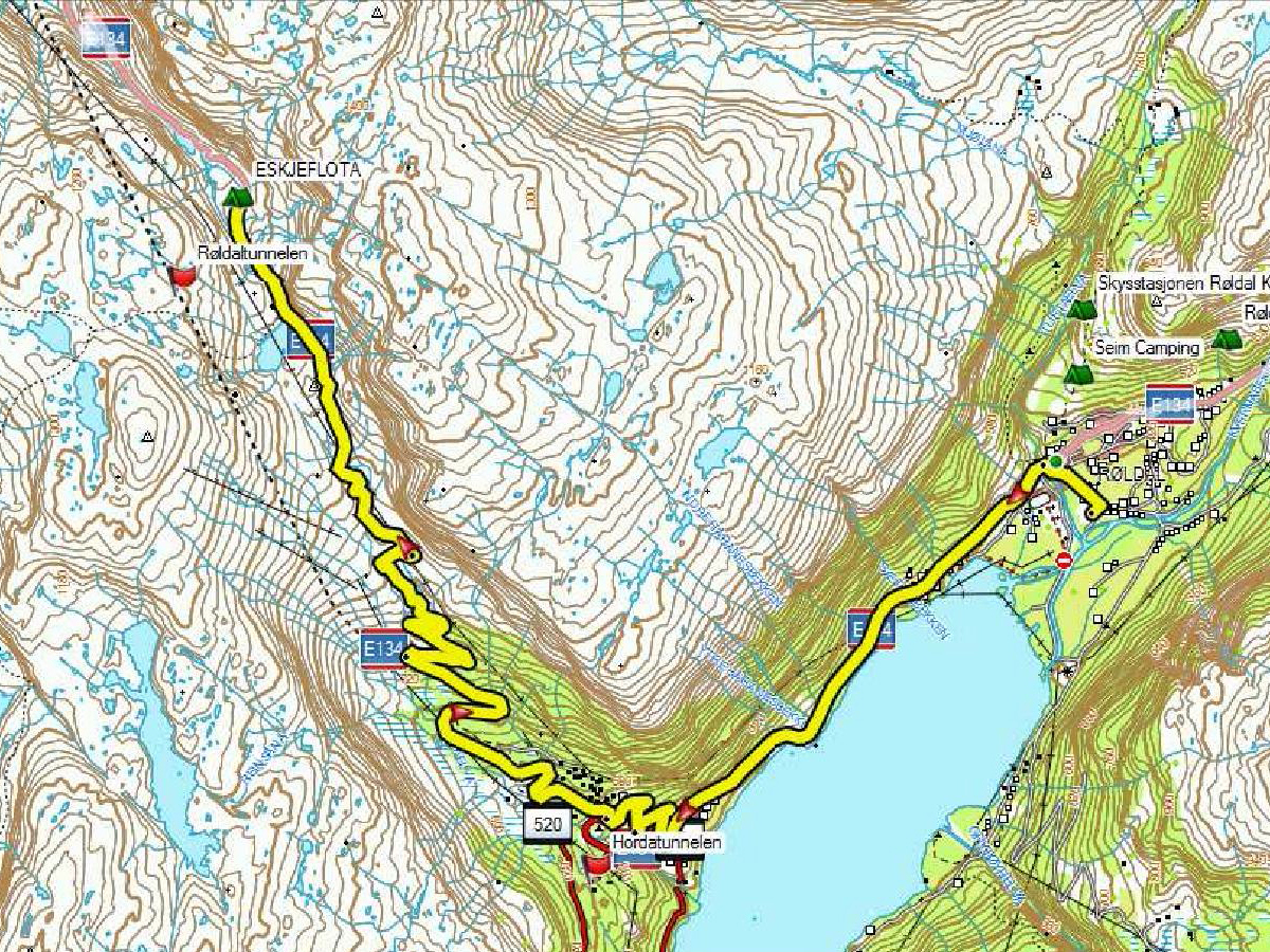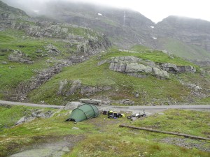 Eins og þeir sem hafa lesið síðustu færslu notaði ég stóran hluta dagsins í Rödal í til skraps, skriftir batteríshleðslu og slíkt og því lagt seint af stað. Eða um klukkann hálf sex um kvöldið. Meininginn var heldur ekki að ná langri dagleið heldur komast upp á næsta fjallaskarð. dagleiðinn varð heldur ekki nema 13km löng enn hækkuninn var 670 metrar og tjaldaði ég rétt fyrir miðnætti í 1070m hæð í þröngu og flottu fjallaskarði . Sofnað skömmu síðar við bjölluhljóm frá norsku fjallasauðfé. Fjallvegur þessi kallast Seljestadjuvet og er þektur í noregi þó hann sé ekki fjölfarinn, enda einungis opin um tvo – þrjá mánuði á ári eftir því sem mínar heimildir herma. Seljestadjuvet liggur yfir Röldalsfjallið og er hluti af fjallveginum um Haukeli sem stórþingið í noregi veitti heimild fyrir árið 1861 til að tengja saman austur og vesturlandið. Þessir fjallvegir voru mikil verk á sínum tíma enda mögulegur verktími einungis nokkrir mánuðir á ári, aðstæður og landslag erfit og vegurinn ekki klár fyrr enn 18 árum síðar. Seljestadjusvet var gerður á árunum 1859-1865 og þykir einn af flottari vegumhverfi í noregi Hinn hluti vegarins um Haukeliheiðinna sjálfa hef ég þegar farið yfir. Í dag er umferðinni aðeins öðrumvísi farið þar sem þjóðvegurinn liggur nú í göngum undir Rölandsfjallið og ég segi sem betur fer, því stór vegur um þetta svæði myndi eyðileggja sjarma þess. Smá viðbótarfróðleikur fyrir þá sem lesa norsku er hér.