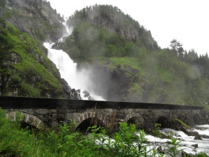 Låtefoss er eins og nafnið ber til kynna frekar háfær, þetta er tignarlegur foss enn ekki ýkja vatnsmikill. Nóg samt til að vekja athygli vegfarenda. Ég sá það einnig á safni sem ég fór á síðar þennann dag að einthverjar umræður hafa verið um að nota vatnið sem fer um fossinn til rafmagnsframleiðslu, enn líklega er þetta eitt af þeim dæmum þar sem náttúran fær að ráða ferðinni og fossin haldi sér um ókomna tíð. Brúinn yfir ána hjá Låtefoss var einnig fyrsta áfanganum sem var lokið við gerð heiðarvegarins sem ég tala um í pistlinum um gærdæginn. Eftir að hafa virt fossin fyrir mér eins og hinir ferðamennirnir var haldið til Odda.